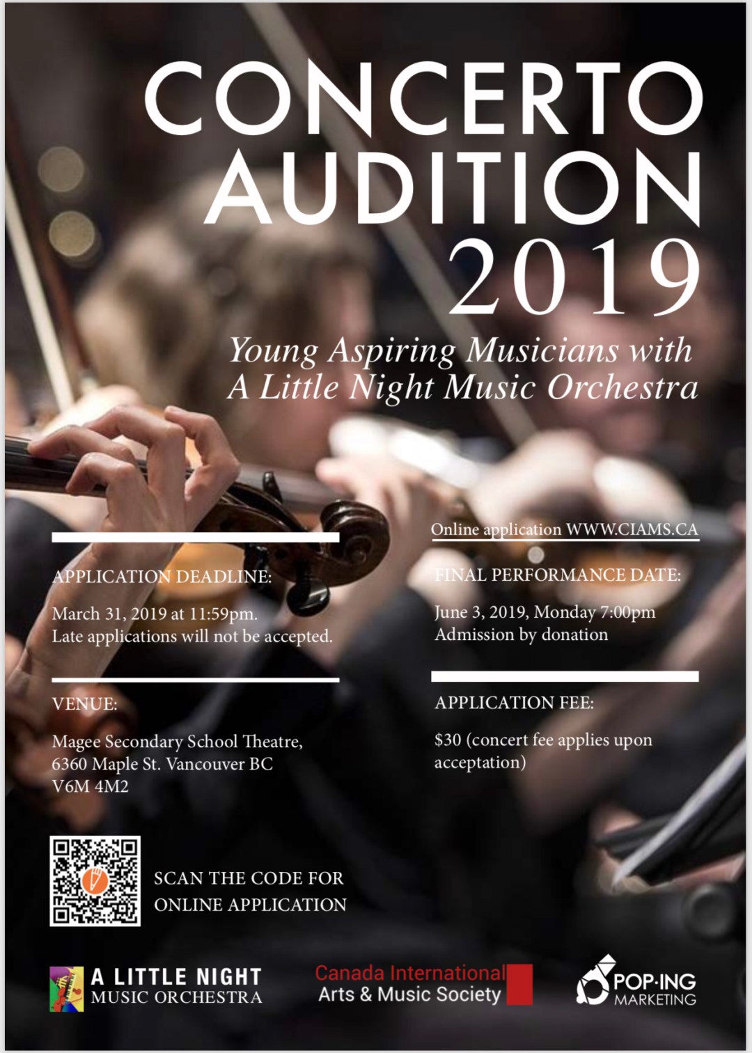 The Canada International Arts and Music Society, in collaboration with A Little Night Music Orchestra, is pleased to announce the 2019 Concerto Concert. This is an opportunity for young aspiring musicians to gain their initial experience performing with full orchestra, conducted by Maestra Alana Chan, the Music Director of A Little Night Music Orchestra (ALNMO, http://www.alnm.ca). This is purely an opportunity for young musicians to perform with an orchestra, not to be in an event of a competition. Due to limited performance time, only maximum of three performers will be selected by a video audition.